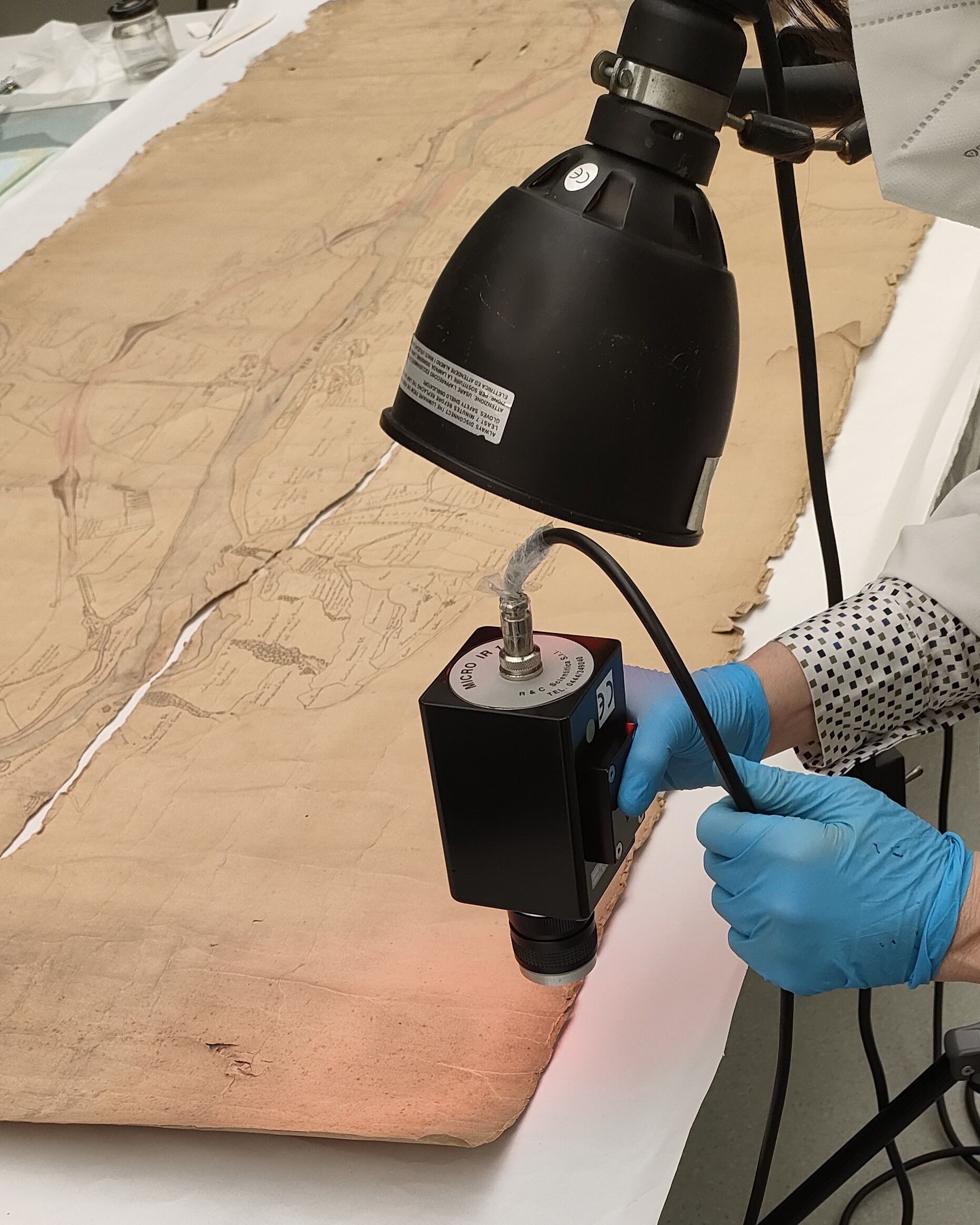 Tratamiento especializado de grabados, dibujos, mapas y legajos. Se ejecutan procesos de limpieza química y mecánica, desacidificación y consolidación, laminación y demás tratamientos para salvar el soporte celulósico y su valor documental.