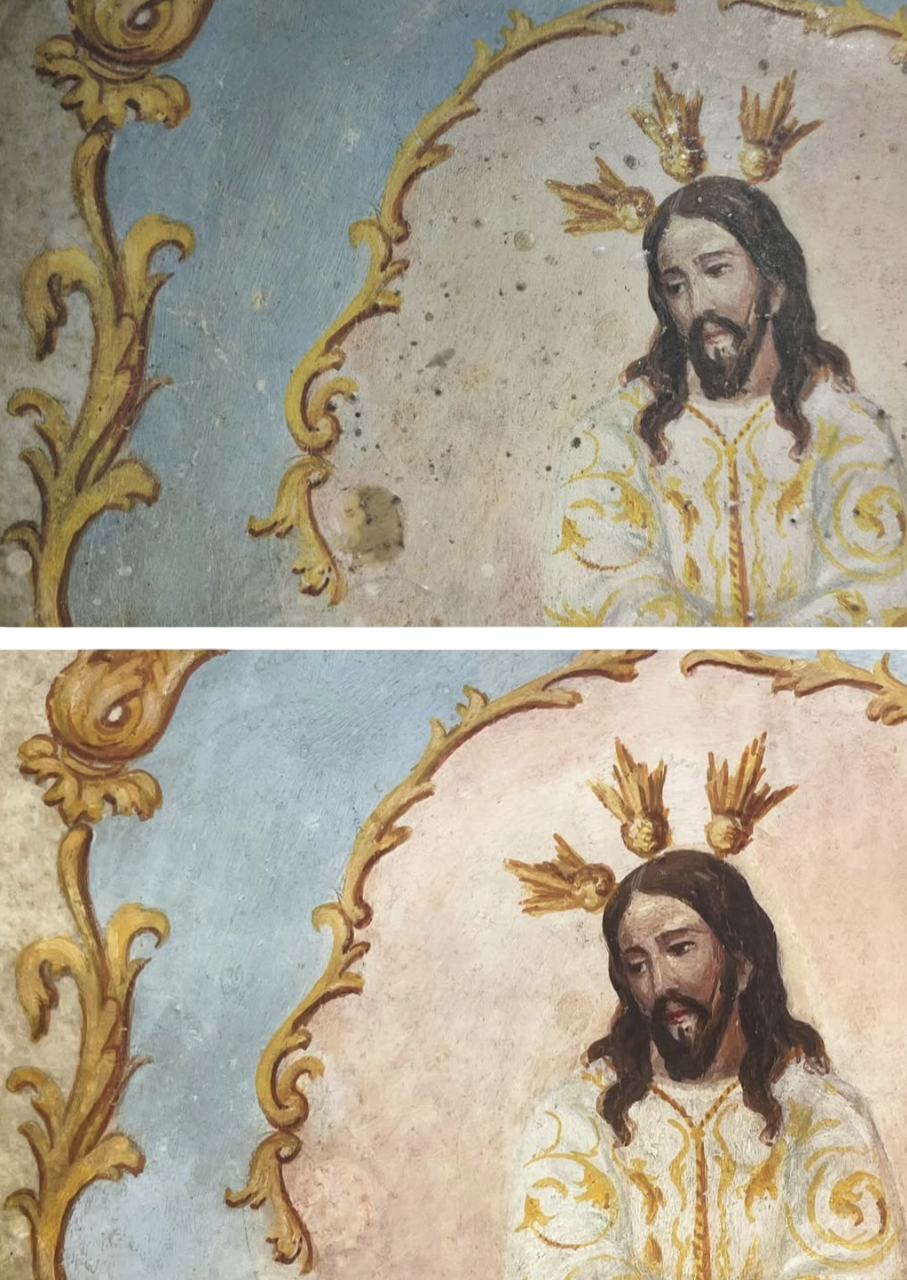 Intervención directa para devolver la lectura estética y el esplendor a la obra. Se aplican procesos de limpieza, consolidación y reintegración bajo los criterios internacionales de reversibilidad y mínima intervención.